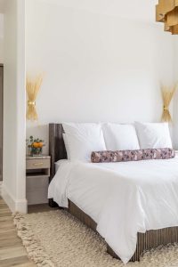 The Earth suite is a nod to one of the most owner’s favorite luxury hotel experiences. As you walk in encounter a full wall of built-in storage perfect for the fashionista.  The suite provides plush European carpeting, original artwork, sculptural lighting, and a luxurious marble shower.  Enjoy the tranquility of your private patio and look out over the Estate’s garden and pond, taking in the stars you can never see at home. After, unwind with a nightcap or a movie screening in the adjacent two-story library bar before you sink into your plush king bed.